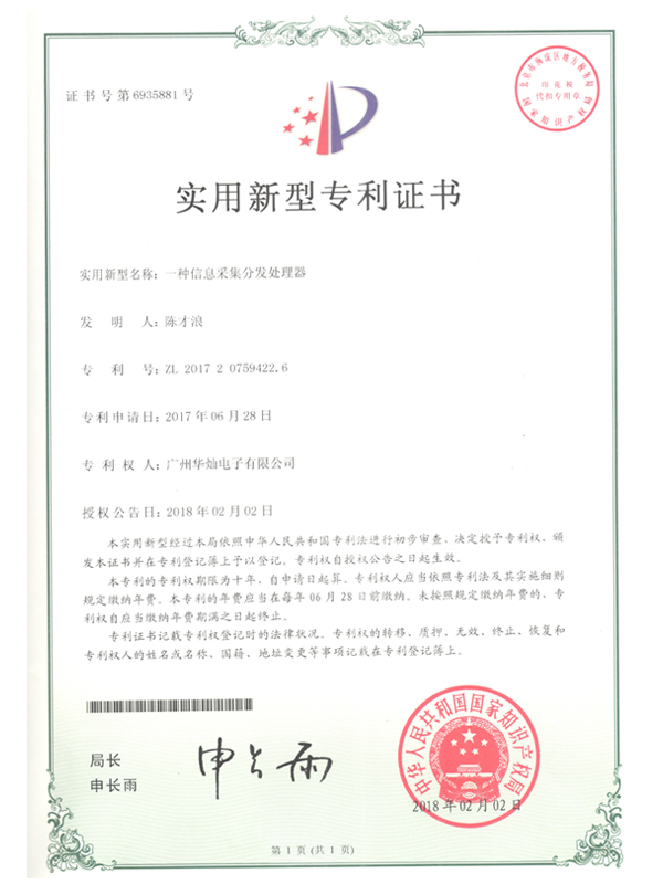 證書號6935881信息采集分發處理器